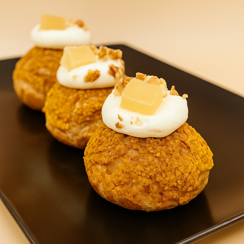 Notre chou citron est composé d’une pâte à choux sur laquelle un craquelin est posé avant la cuisson. Il est garni d’une crème citron à la meringue italienne.